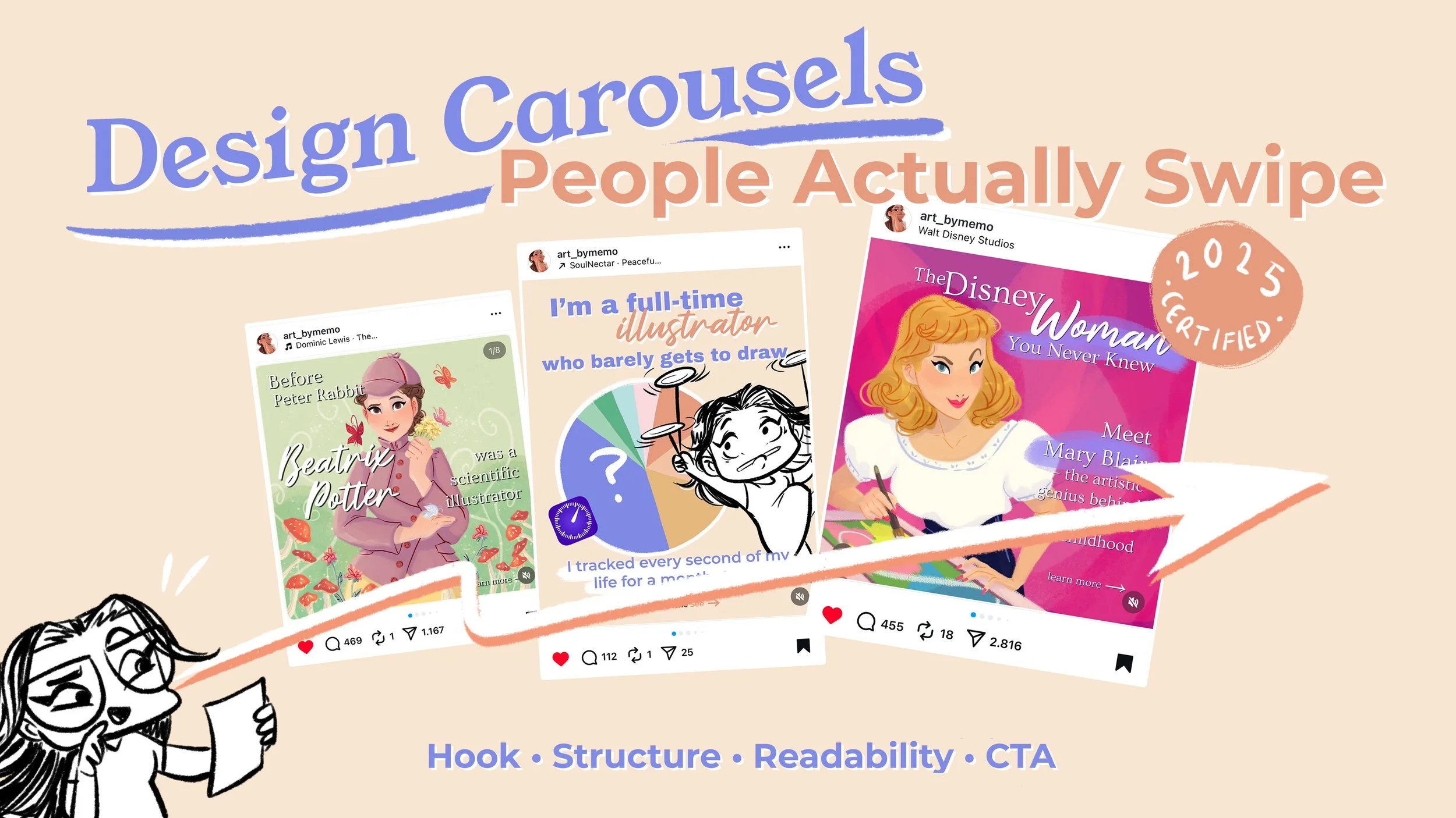 Even educational carousels need a beginning, middle, and end. Treat them like mini comics: hook → insight → payoff.